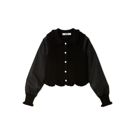 波編みの身頃が程よい重厚感と立体感を出し、衿とカフスにはフリルをあしらって華やかさをプラス。袖には柔らかく微光沢なソフトオーガンジーを使用し、軽やかでふんわりとした印象を演出。身頃と袖の質感のギャップが、羽織るだけで女性らしい華やかさと高級感を添える一着。