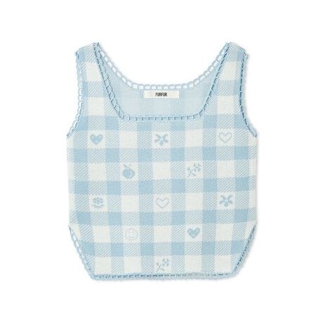 ジャカードでギンガムチェックを編み立て、チェック柄の中にハートやフラワー、フルーツ、スマイルマークなどのモチーフをピクセルタッチで配置したユーモラスなデザイン。さまざまなボトムに合わせやすく、春から夏にかけて快適に着用できる軽やかな素材感。