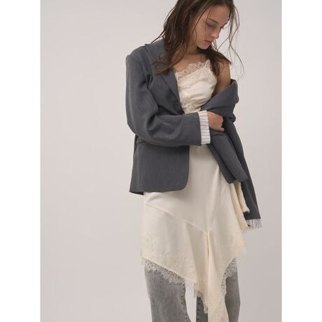 トレンド感のあるランジェリーライクに仕立てたサテンキャミトップスが登場。胸元や裾にテープレースをふんだんに使用しドレッシーに仕上げました。シボ感を加えたとろみサテン生地を使用し、普段使いにもしやすいデザインです。ふんわり柔らかな生地が、裾に向かって流れるようなラインを描きます。膝下の裾のモードなアシメデザインが、歩くと軽やかに揺れて華やかな印象に。オーバーサイズジャケット(SWFJ261134)や、デニムパンツ(SWFP261223)合わせがおすすめです。