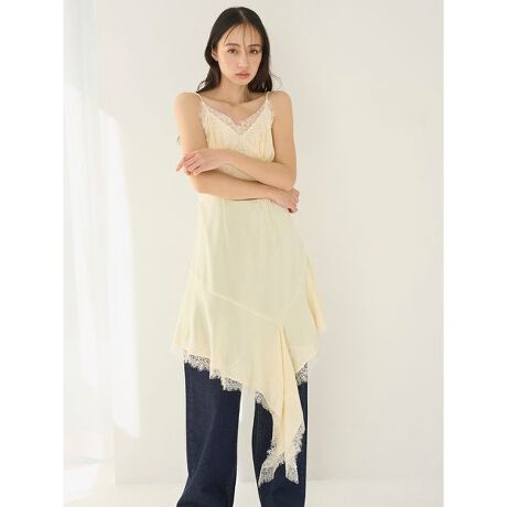 トレンド感のあるランジェリーライクに仕立てたサテンキャミトップスが登場。胸元や裾にテープレースをふんだんに使用しドレッシーに仕上げました。シボ感を加えたとろみサテン生地を使用し、普段使いにもしやすいデザインです。ふんわり柔らかな生地が、裾に向かって流れるようなラインを描きます。膝下の裾のモードなアシメデザインが、歩くと軽やかに揺れて華やかな印象に。オーバーサイズジャケット(SWFJ261134)や、デニムパンツ(SWFP261223)合わせがおすすめです。