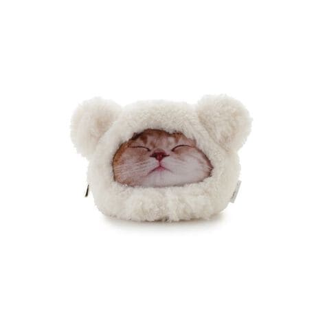 耳付きのもこもこニットキャップを被って、気持ちよさそうに眠るころもくんのお顔をフォトプリントしたぬいぐるみポーチです。