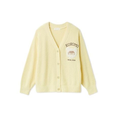 耳付きニットキャップを被って、気持ちよさそうに眠るころもくんをあしらったニットカーディガンです。