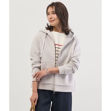 立体的なシルエットを描いた、さっと羽織りやすいパーカー。使い勝手の良い逆開ファスナーで、着こなしのアレンジも自在です。フードに通した配色テープの先にメタルコードエンドを施し、カジュアルなパーカーに大人っぽい洗練された印象をプラスしています。まだ肌寒い時期に、中間アウターとして活躍する、着回し力抜群の1着です。カラーは、ベーシックで合わせやすいライトグレー(#003)、女性らしいやわらかな印象のライトベージュ(#033)、洗練された印象のスモーキーミント(#062)、リラックス感と落ち着きのあるネイビー(#075)の4色展開です。