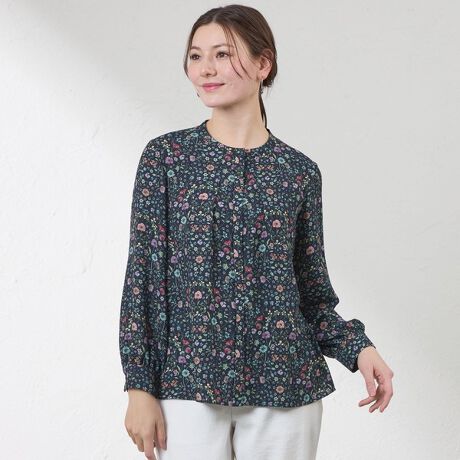首元にタックを施した前開きのブラウス。