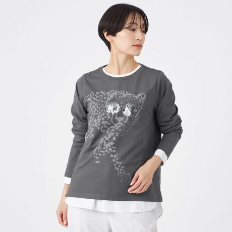 すっきりとしたシルエットにこだわった?袖カットソー。フロントは存在感あふれるチーターのグラフィックがプリントされています。スパンコールで埋めつくしためがねは、キラキラかがやいて存在感間違い無しのアイテムです。