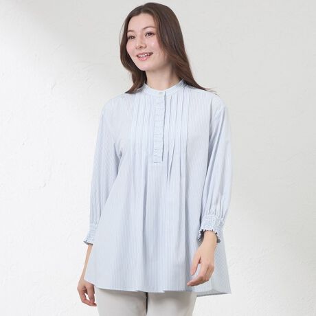 身頃に中縫いタックが入ったチュニック丈で、裾に向かってふんわりと広がる軽やかなシルエットです。