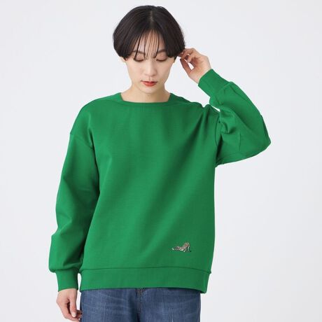 チーターワッペンがポイントの、大人かわいいスウェット。ワッペンがアクセントになったスウェットです。衿元は、テレコ素材でボートネック風にアレンジしています。シンプルに1枚でも、シャツとのレイヤードでもサマになるアイテムです。チーターワッペンは、グーンと伸びをしている所を捉えたモチーフにおり、可愛さもありながらも大人なワッペンを作りました。生地に直接刺繍したように見えるのが特徴で特殊な加工を施した新技術のワッペンです。