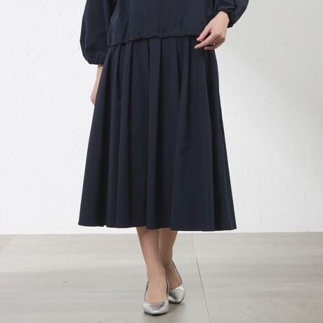 ストレッチ性とウエストゴム仕様によって快適にお召しいただけるタックフレアスカートです。