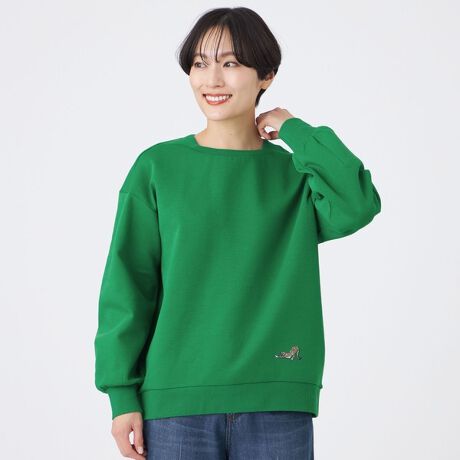 チーターワッペンがポイントの、大人かわいいスウェット。ワッペンがアクセントになったスウェットです。衿元は、テレコ素材でボートネック風にアレンジしています。シンプルに1枚でも、シャツとのレイヤードでもサマになるアイテムです。チーターワッペンは、グーンと伸びをしている所を捉えたモチーフにおり、可愛さもありながらも大人なワッペンを作りました。生地に直接刺繍したように見えるのが特徴で特殊な加工を施した新技術のワッペンです。