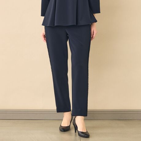 きれい見えしながらもウエストゴム仕様でストレスのない快適な履き心地を実現。