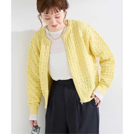編み柄と素材感が引き立つ柄編みZIPニットカーディガン。