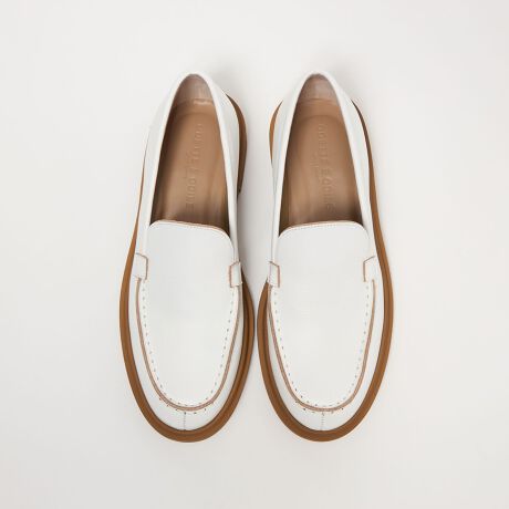 ホワイトはモカ部分の切りっぱなしから下地のベージュを出し、押縁とソールも同色系でまとめることで、ホワイトとのコンビネーションをより引き立てています。