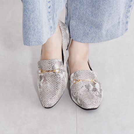 すっきりとしたトゥと華奢なビット、ヒールについたメタルパーツで女性らしさと上品さをプラス。