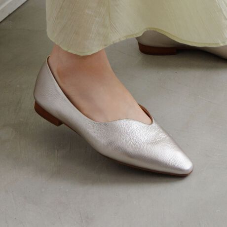 甲深めにウェーブされた履き口が印象的なフラットシューズ。フラットながら、程よく長めのトゥと斜めに施されたウェーブカットが脚をすっきりと見せてくれます。