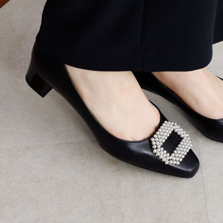ラグジュアリーな輝きを放つパールビジューバックルがアクセントのパンプス。きらめくパールビジューがコーデを華やかに引き立ててくれます。