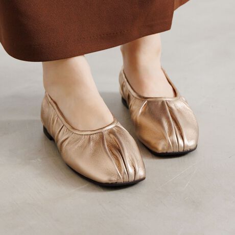 ソフトレザーならではの柔らかなギャザーデザインがポイントのフラットパンプス。