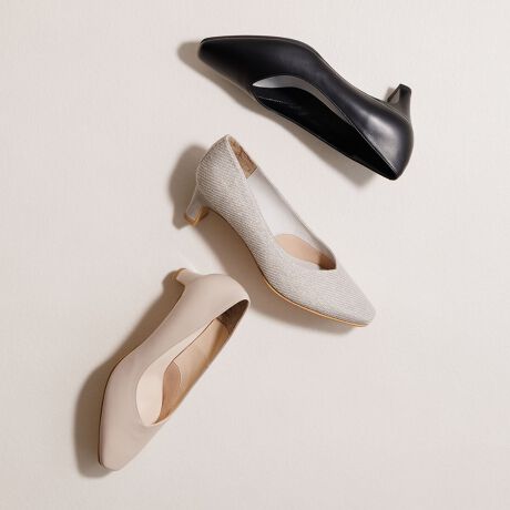 ソフトなスクエアトゥが大人の女性らしい洗練された佇まいを感じさせるプレーンパンプス。通常の位置より後ろにセットしたセットバックヒールがポイント。