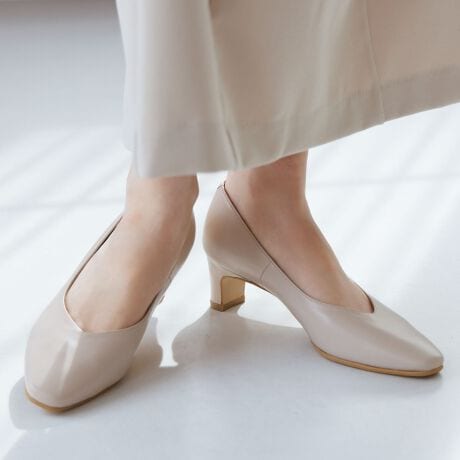 ソフトなスクエアトゥが大人の女性らしい洗練された佇まいを感じさせるプレーンパンプス。通常の位置より後ろにセットしたセットバックヒールがポイント。