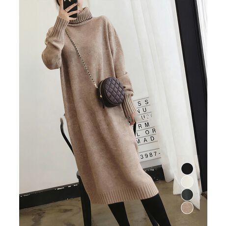 顔周りを印象的に魅せるタートルネックで、首元までしっかり暖かいロング丈ニットワンピース。