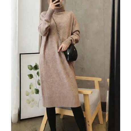 顔周りを印象的に魅せるタートルネックで、首元までしっかり暖かいロング丈ニットワンピース。