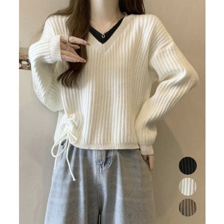 Vネックの配色レイヤード風デザインが目を引く、レディース向けリブニットトップス。