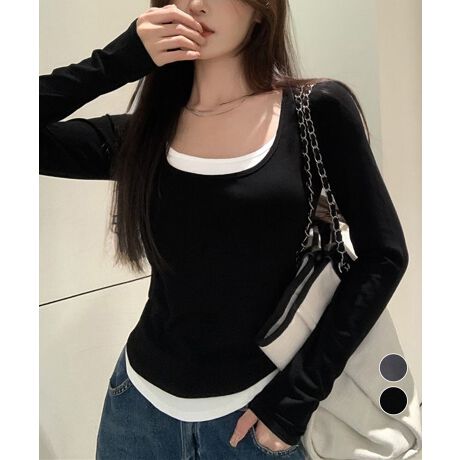 フェイクレイヤード風デザインがコーデのポイントになる。