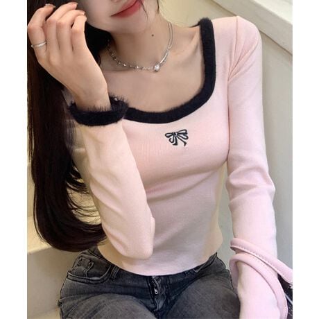 デコルテを美しく見せるクールネックに、繊細な刺しゅうを施した長袖トップス。