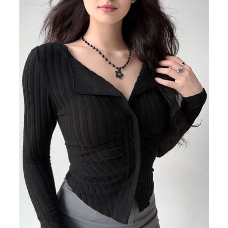 ボタンの開け具合次第でセクシーにも大人っぽくも着こなせる一枚。