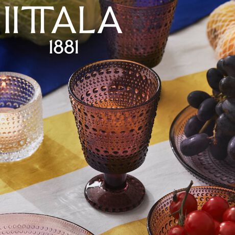 「カルーナ」(高地に咲くことで知られる植物ヒース。別名エリカ)は、温かみのある色でありながら、クールさを備えたナチュラルなくすみカラー。可愛らしいコーディネートにも、モノトーンのシックなテーブルの差し色としても活躍します。カステヘルミはフィンランド語で「露のしずく」という意味。朝日を浴びて、まるで連なる真珠のようにきらめく朝露にインスピレーションを得てデザインされました。1964年にオイバ・トイッカがデザインし、2010年にリニューアルされています。連なるガラスのしずくのようなデコレーションは、当初は製造過程で残った接合部を隠すためのアイデアでしたが、トイッカはこれをとても気に入り、全体にあしらわれることになりました。結果的に、このデザインは輝くガラスの美しさを際立たせています。