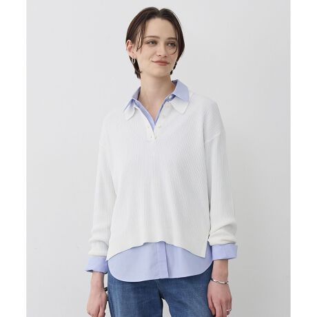 ■デザイントラッドな雰囲気を持つポロニットを、ICBらしく洗練された印象に仕上げた一枚です。縦のラインを強調する編地がすっきりとしたシルエットを演出し、カジュアルからきれいめまで幅広いスタイリングにマッチします。 一枚での着用はもちろん、インナーにシャツを合わせたレイヤードスタイルもおすすめです。襟元からシャツを覗かせることで、トレンド感のある着こなしをお楽しみいただけます。