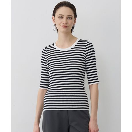 ■デザイン体に程よくフィットするクルーネックのリブプルオーバーです。一枚着としてはもちろん、ジャケット、羽織のインナーとしても着まわしやすいベーシックなデザインです。カラー展開はインナーとしても重宝するオフホワイト(002)、ブラック(005)、今季新色のライトデニムボーダー、ネイビーボーダー(175)の4色展開です。