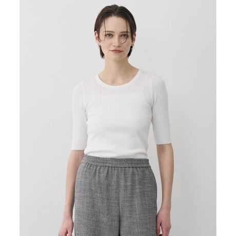■素材インドのオーガニックコットンを使用したニットのようなワイドリブ素材です。オーガニックの中でも滑らかな光沢をもつ糸で編立て、ベーシックなアイテムとしてシーンレスに活躍する素材。身体のラインをひろいにくく、1枚でも着やすい厚さでデイリーに活躍します。