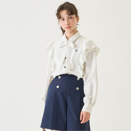 胸元のボウタイが上品な雰囲気を演出するブラウスです。細かなドット柄でシンプルにまとめ、スカートにもボトムスにも合わせやすいのが魅力。袖のつけ外しができる2WAY仕様なので、シーズンやコーディネートに合わせて着回せます。刺しゅうの裏に「あて布」はございません。