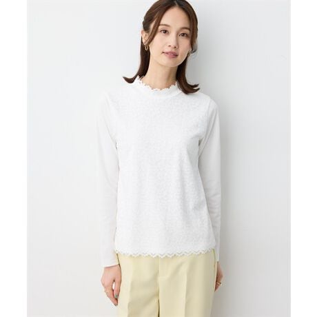 [型番:351684]華やかなムード漂う前身レースハイネックプルオーバーフロントのレース切り替えが表情豊かな印象を与えるプルオーバー首元はハイネックのデザインになっているので暖かく、落ち着きのある風合いを演出します。トップスとしてはもちろん、インナーとしても活躍してくれるアイテム。季節の変わり目のレイヤードスタイルに重宝します。