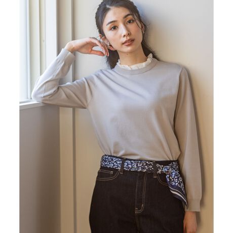 [型番:352683]首元のフリルが可愛らしいワンポイントになるドッキングプルオーバー。フリルは取り外しできるので、その日の気分やシーンに合わせて使い分けを楽しめます。生地端のリブ切り替えが心地よいフィット感を演出。パンツやスカートなど、様々なボトムスと相性の良いアイテムです。