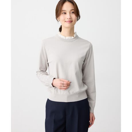 [型番:352683]首元のフリルが可愛らしいワンポイントになるドッキングプルオーバー。フリルは取り外しできるので、その日の気分やシーンに合わせて使い分けを楽しめます。生地端のリブ切り替えが心地よいフィット感を演出。パンツやスカートなど、様々なボトムスと相性の良いアイテムです。