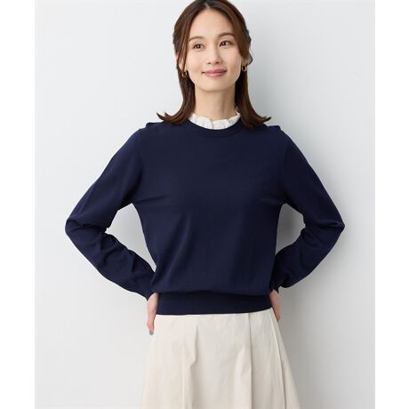 [型番:352683]印象の変化を楽しめるフリル衿プルオーバー首元のフリルが可愛らしいワンポイントになるドッキングプルオーバー。フリルは取り外しできるので、その日の気分やシーンに合わせて使い分けを楽しめます。生地端のリブ切り替えが心地よいフィット感を演出。パンツやスカートなど、様々なボトムスと相性の良いアイテムです。