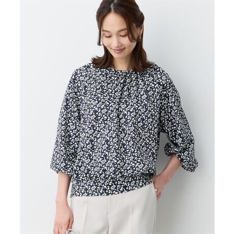 [型番:353838]表情豊かな花柄プリントが施されたブラウス細やかな花柄プリントがエレガントさを引き立たせるブラウス。裾はシャーリング切り替えを施しており、フィット感のある着心地を演出します。斜めに切り替えられたラグランスリーブが魅力的。シンプルな無地のボトムスと合わせたコーディネートがおすすめです。