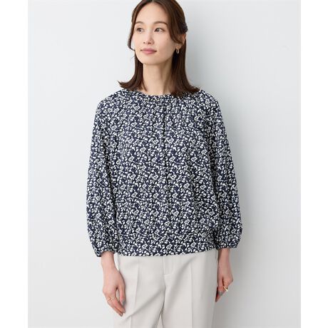 [型番:353838]表情豊かな花柄プリントが施されたブラウス細やかな花柄プリントがエレガントさを引き立たせるブラウス。裾はシャーリング切り替えを施しており、フィット感のある着心地を演出します。斜めに切り替えられたラグランスリーブが魅力的。シンプルな無地のボトムスと合わせたコーディネートがおすすめです。