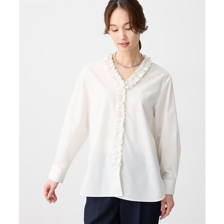 ネックラインから前立てにかけて施されたフリルがアクセントになるブラウス。