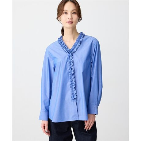 [型番:353839]くしゅっとしたフリルが可愛らしいV開きブラウスネックラインから前立てにかけて施されたフリルがアクセントになるブラウス。Vネックのデザインがすっきりとした印象を与え、女性らしさを演出します。袖口に寄せられたタックが立体感をプラス。タックインはもちろん、タックアウトスタイルもおすすめです。
