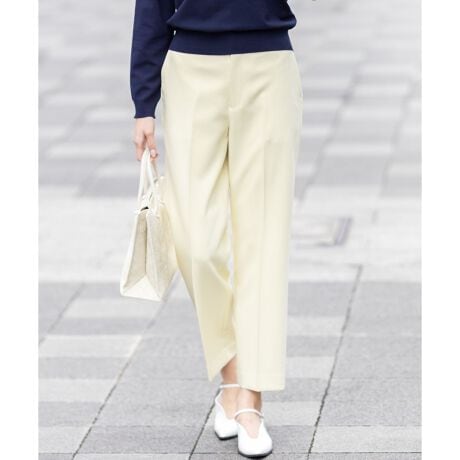 [型番:354134]程よい厚みのある二重織素材を使用した、ストレッチテーパードパンツ。すっきりとしたシルエットながら、伸びのある素材で快適な穿き心地を叶えます。ウエストは後ろゴム仕様で、きちんと感とリラックス感を両立。同系色トップスでまとめて、洗練されたワントーンコーデも楽しめます。
