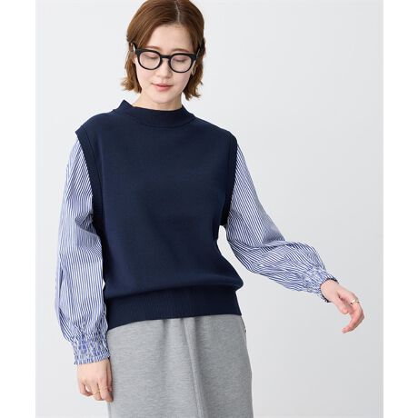 [型番:522422]一枚で重ね着見え、きちんと感も叶うドッキングトップスニットベストと布帛スリーブを組み合わせた、異素材ドッキングデザインのプルオーバー。身頃はすっきり、袖に程よいボリュームを持たせることで、バランスよく着こなせます。パンツにもスカートにも合わせやすく、通勤からデイリーまで幅広く活躍する一枚です。