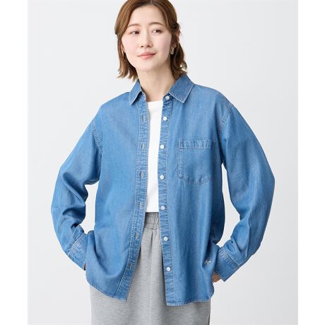 [型番:523291]軽やかに羽織れてきれいめに決まる大人デニムテンセル混のやわらかなデニム素材を使用し、落ち感のある風合いに仕上げたシャツ。ほどよくゆとりのあるシルエットで、一枚着としてはもちろん羽織りとしても活躍します。デニムながらカジュアルすぎず、スカートにもパンツにも合わせやすい万能アイテムです。
