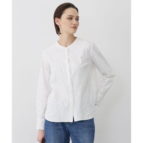 ■デザインジャケットインでも着映えする、カットジャガードの表情感が特徴のデザイントップスです。生地の凹凸感で表現されたゼブラ柄のジャガードが、モードな印象を演出。衿、前立て、カフスにはサテン素材を使用し、メリハリのある切り替えデザインに仕上げました。ブラウスのようなきちんと感がありながらも、カットソー素材のためストレスフリーに着用できるのが魅力の一枚です。