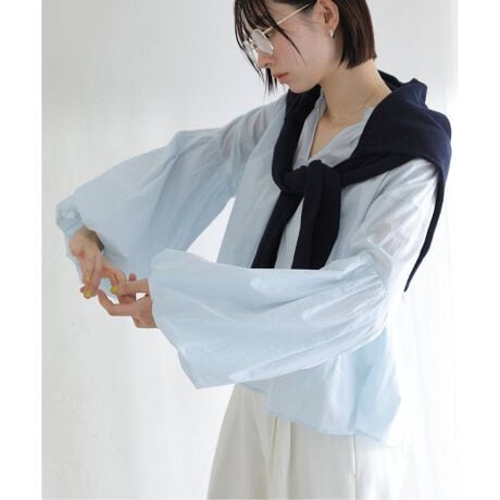 首元の繊細なフリルと、ふんわりとしたボリュームスリーブが女性らしいブラウス。