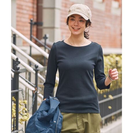 シンプルながらも計算された女性らしさを引き立てる7分袖ボートネックTシャツ