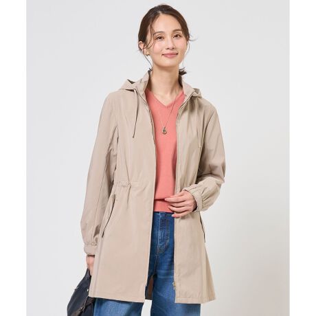 ■デザイン肌寒い季節にさっと羽織れる、軽やかな仕立てが魅力のコート。前立てから連なるスタンドカラーは、ファスナーを閉めればコンパクトに、開ければ軽やかに着こなせるデザインです。フードが取り外しできる2WAY仕様なので、きれいめからカジュアルな装いまで、幅広いスタイリングを楽しめます。ウエスト部分のドロストでシルエット調整もできます。袖口はゴムとタブ付で調節可能なため、肌寒い時期にも最適。1枚持っておくと様々なスタイルに合わせやすい頼れるアウターです。裏地なしです。