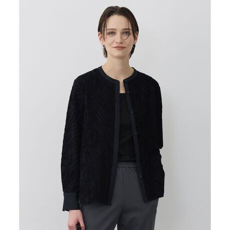 ■デザインジャケットインでも着映えする、カットジャガードの表情感が特徴のデザイントップスです。生地の凹凸感で表現されたゼブラ柄のジャガードが、モードな印象を演出。衿、前立て、カフスにはサテン素材を使用し、メリハリのある切り替えデザインに仕上げました。ブラウスのようなきちんと感がありながらも、カットソー素材のためストレスフリーに着用できるのが魅力の一枚です。