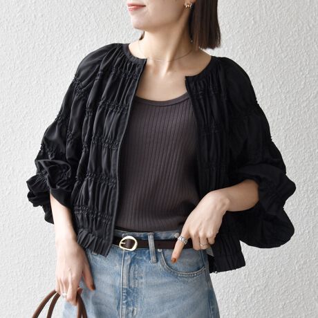 シンプルな装いにさっと羽織るだけで、スタイリングに程よい華やかさをプラス。